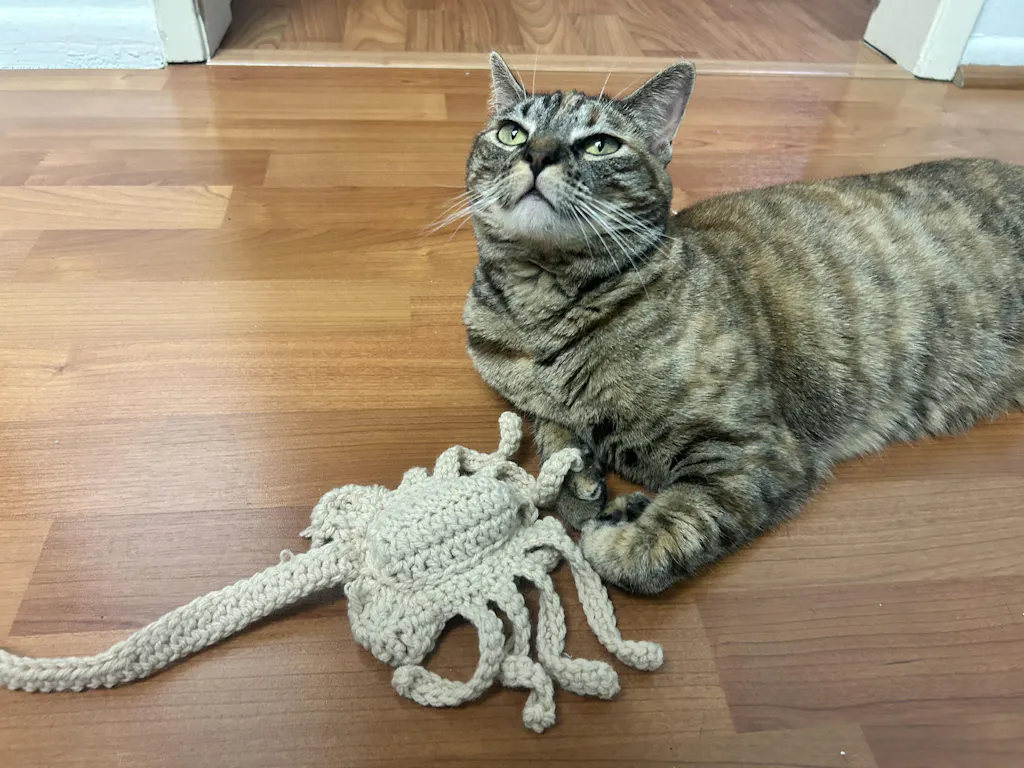 Hand crocheted in a smoke free home and made to order, this toy can be customized to be stuffed with catnip, crinkles, jingle bell or plain stuffy. Please note that the legs of this toy will have a natural curve to them that may make them coil a bit.