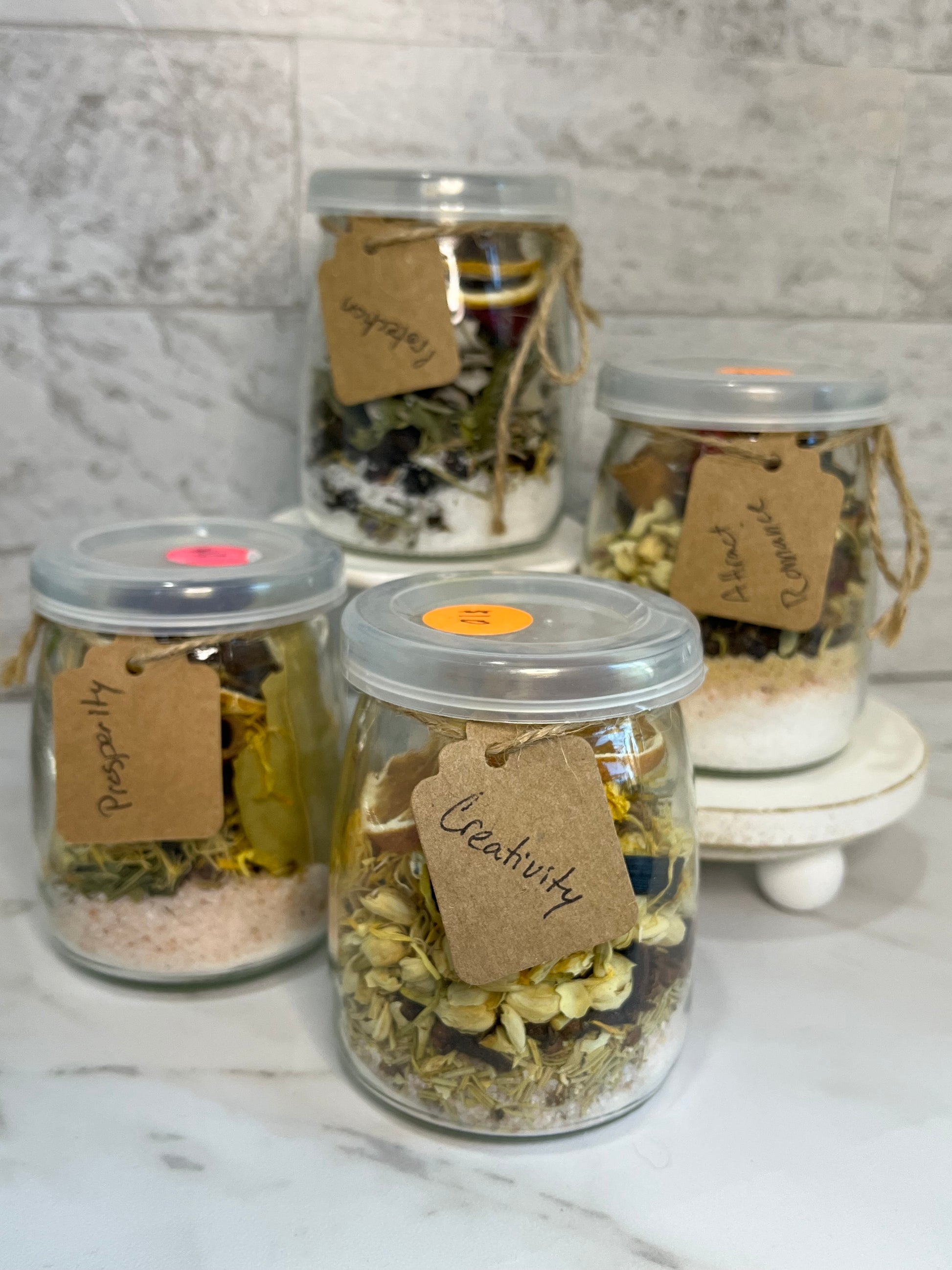 Immerse yourself in sacred self-care with our *Intention Ritual Bath Soaks* — a metaphysical blend of mineral-rich Epsom and pink Himalayan salts, dried herbs, dried flowers, fruits, and pure essential oils. Each soak is crafted with purpose to support your unique ritual, guiding energy toward your desired outcome — whether you seek creativity, protection, love, or abundance.