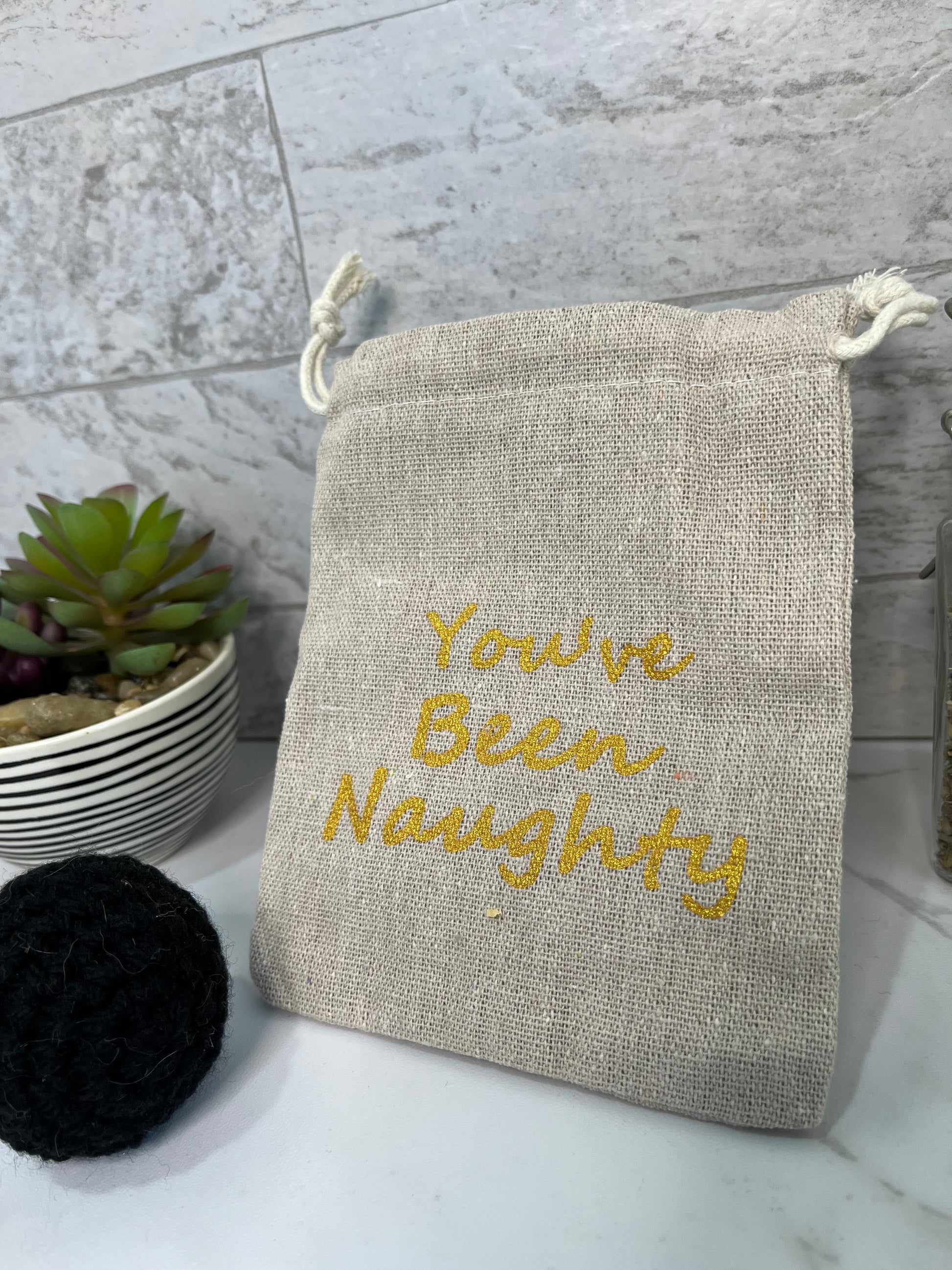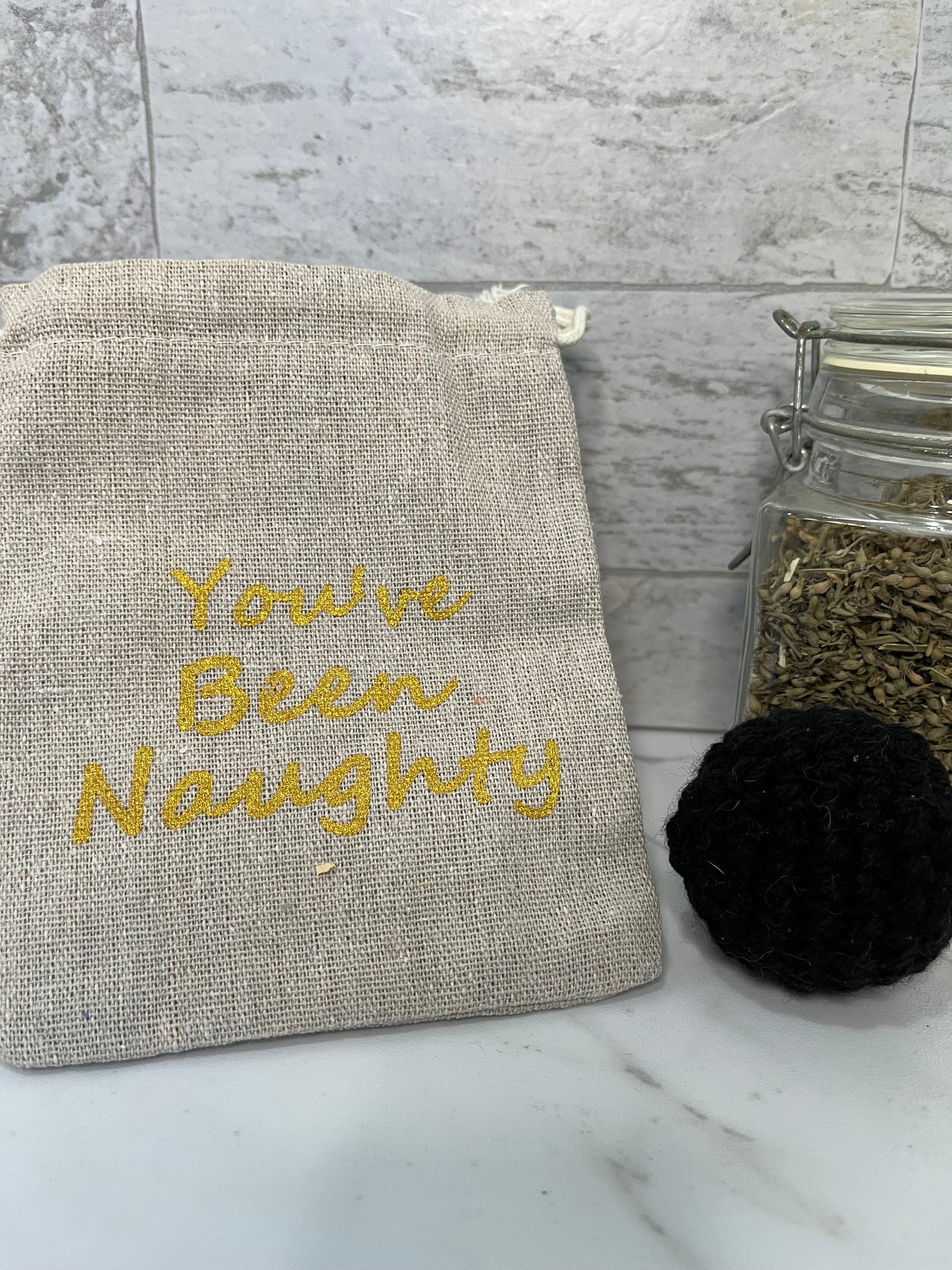 Each adorable gift set starts with a burlap-esque pouch with gold "You've Been Naughty" emblazoned on it and contains contains three crocheted "lumps" of coal, which will be an assortment of 1 catnip, 1 crinkle and 1 jingle bell finish per set.